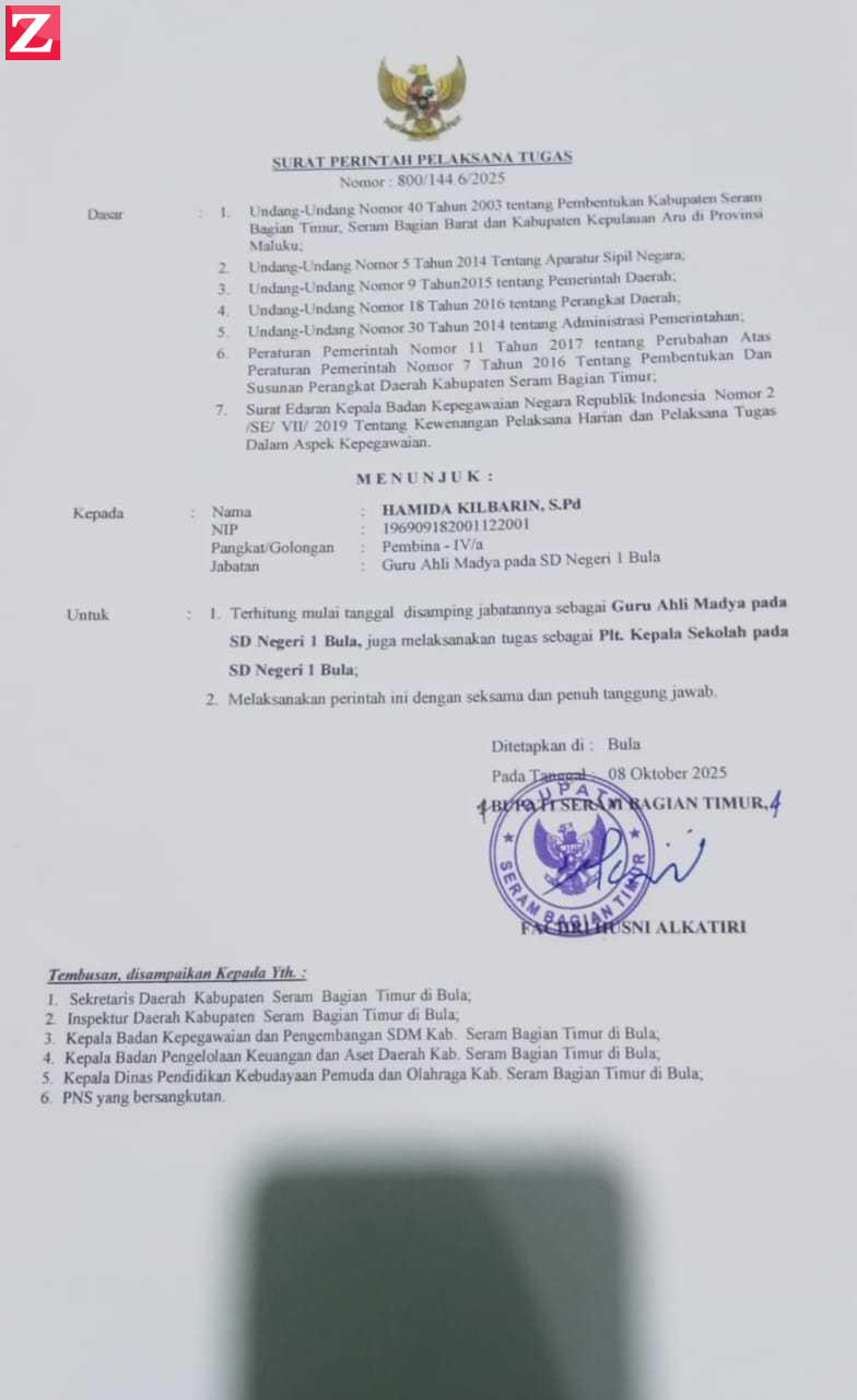 Sementara pada Tanggal 23 Oktober tahun 2025, Bupati Alkatiri kembali menerbitkan SK Pelaksana Tugas Kepala SDN 5 Sesar kepada Hamida Kilbaren.