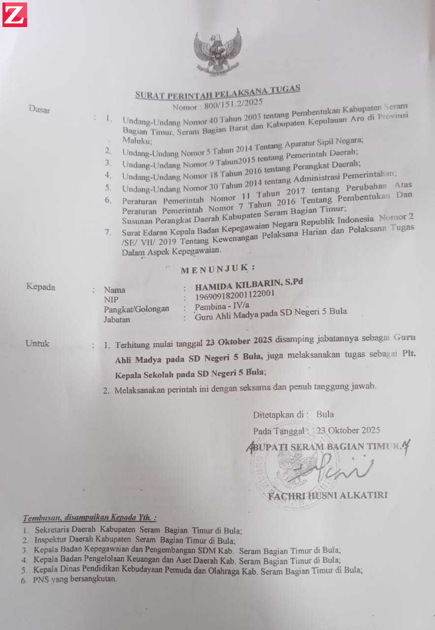 Sementara pada Tanggal 23 Oktober tahun 2025, Bupati Alkatiri kembali menerbitkan SK Pelaksana Tugas Kepala SDN 5 Sesar kepada Hamida Kilbaren.
